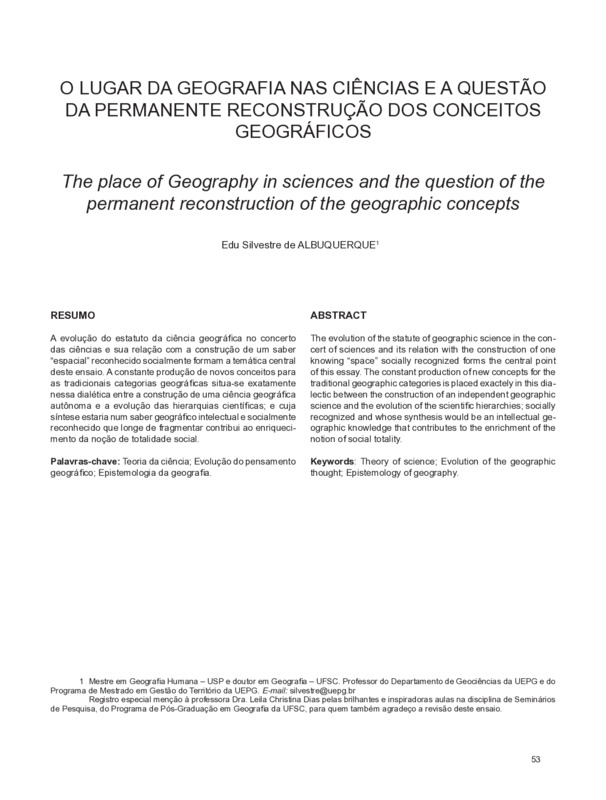 A evolução do estatuto da ciência geográfica no concerto das ciências e sua relação com a construção de um saber “espacial” reconhecido socialmente formam a temática central deste ensaio. A constante produção de novos conceitos para as tradicionais categorias geográficas situa-se exatamente nessa dialética entre a construção de uma ciência geográfica autônoma e a evolução das hierarquias científicas; e cuja síntese estaria num saber geográfico intelectual e socialmente reconhecido que longe de fragmentar contribui ao enriquecimento da noção de totalidade social.