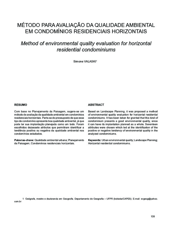 Com base no Planejamento da Paisagem, sugere-se um método de avaliação da qualidade ambiental em condomínios residenciais horizontais. Parte-se do pressuposto de que um condomínio apresente boa qualidade ambiental, já que pode ter sua implantação planejada como um todo. Foram escolhidos dezessete atributos que permitiram identificar a tendência positiva ou negativa da qualidade ambiental nos condomínios estudados.