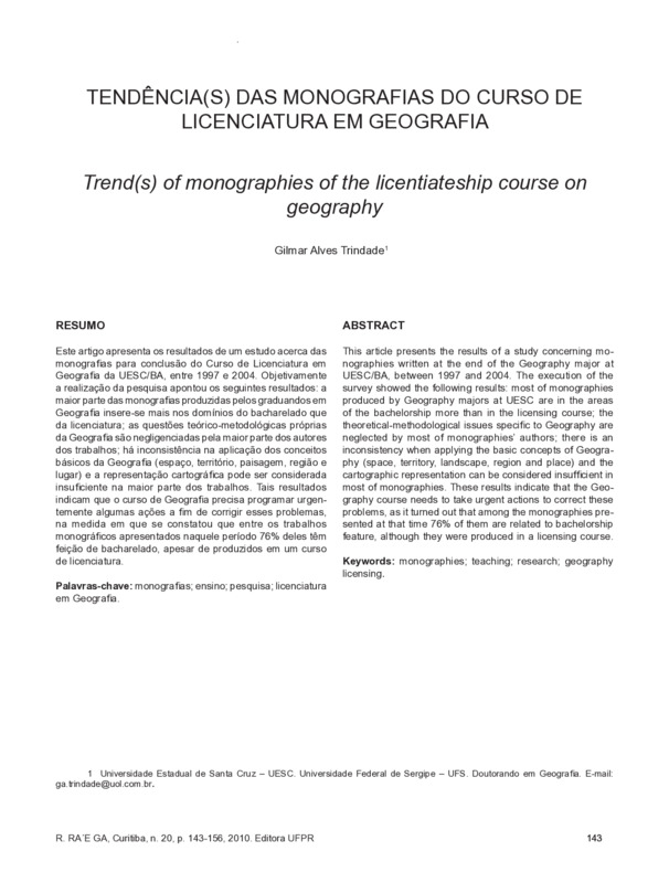 Este artigo apresenta os resultados de um estudo acerca das monografias para conclusão do Curso de Licenciatura em Geografia da UESC/BA, entre 1997 e 2004. Objetivamente a realização da pesquisa apontou os seguintes resultados: a maior parte das monografias produzidas pelos graduandos em Geografia insere-se mais nos domínios do bacharelado que da licenciatura; as questões teórico-metodológicas próprias da Geografia são negligenciadas pela maior parte dos autores dos trabalhos; há inconsistência na aplicação dos conceitos básicos da Geografia (espaço, território, paisagem, região e lugar) e a representação cartográfica pode ser considerada insuficiente na maior parte dos trabalhos. Tais resultados indicam que o curso de Geografia precisa programar urgentemente algumas ações a fim de corrigir esses problemas, na medida em que se constatou que entre os trabalhos monográficos apresentados naquele período 76% deles têm feição de bacharelado, apesar de produzidos em um curso de licenciatura.