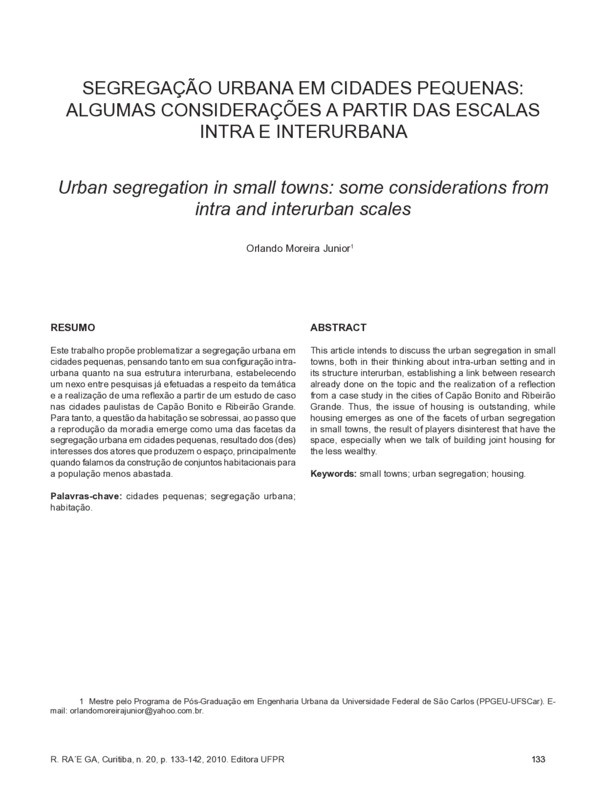 Este trabalho propõe problematizar a segregação urbana em cidades pequenas, pensando tanto em sua configuração intra-urbana quanto na sua estrutura interurbana, estabelecendo um nexo entre pesquisas já efetuadas a respeito da temática e a realização de uma reflexão a partir de um estudo de caso nas cidades paulistas de Capão Bonito e Ribeirão Grande. Para tanto, a questão da habitação se sobressai, ao passo que a reprodução da moradia emerge como uma das facetas da segregação urbana em cidades pequenas, resultado dos (des) interesses dos atores que produzem o espaço, principalmente quando falamos da construção de conjuntos habitacionais para a população menos abastada.