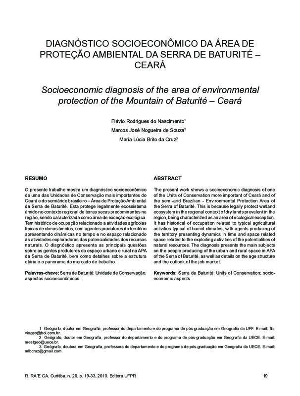 O presente trabalho mostra um diagnóstico socioeconômico de uma das Unidades de Conservação mais importantes do Ceará e do semiárido brasileiro – Área de Proteção Ambiental da Serra de Baturité. Esta protege legalmente ecossistema úmido no contexto regional de terras secas predominantes na região, sendo caracterizada como área de exceção ecológica. Tem histórico de ocupação relacionado a atividades agrícolas típicas de climas úmidos, com agentes produtores do território apresentando dinâmicas no tempo e no espaço relacionado às atividades exploradoras das potencialidades dos recursos naturais. O diagnóstico apresenta as principais questões sobre as gentes produtores do espaço urbano e rural na APA da Serra de Baturité, bem como detalhes sobre a estrutura etária e o panorama do mercado de trabalho.