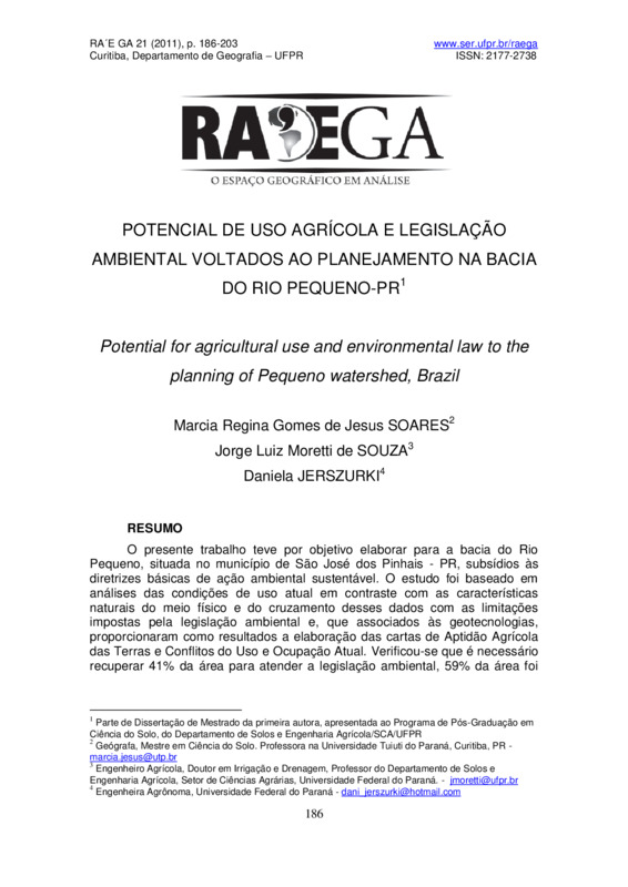 POTENCIAL DE USO AGRÍCOLA E LEGISLAÇÃO AMBIENTAL VOLTADOS AO PLANEJAMENTO NA BACIA DO RIO PEQUENO-PR