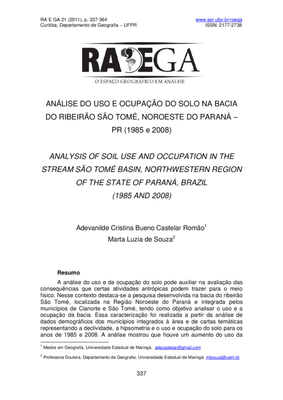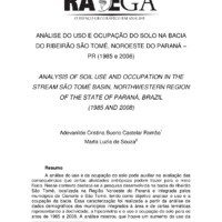 ANÁLISE DO USO E OCUPAÇÃO DO SOLO NA BACIA DO RIBEIRÃO SÃO TOMÉ, NOROESTE DO PARANÁ – PR (1985 e 2008)