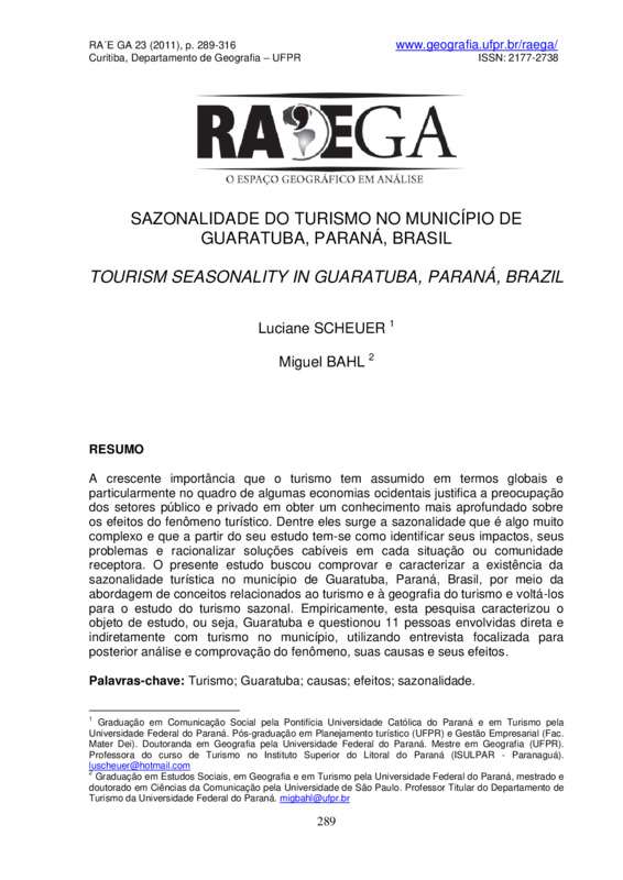 A crescente importância que o turismo tem assumido em termos globais e particularmente no quadro de algumas economias ocidentais justifica a preocupação dos setores público e privado em obter um conhecimento mais aprofundado sobre os efeitos do fenômeno turístico. Dentre eles surge a sazonalidade que é algo muito complexo e que a partir do seu estudo tem-se como identificar seus impactos, seus problemas e racionalizar soluções cabíveis em cada situação ou comunidade receptora. O presente estudo buscou comprovar e caracterizar a existência da sazonalidade turística no município de Guaratuba, Paraná, Brasil, por meio da abordagem de conceitos relacionados ao turismo e à geografia do turismo e voltá-los para o estudo do turismo sazonal. Empiricamente, esta pesquisa caracterizou o objeto de estudo, ou seja, Guaratuba e questionou 11 pessoas envolvidas direta e indiretamente com turismo no município, utilizando entrevista focalizada para posterior análise e comprovação do fenômeno, suas causas e seus efeitos.