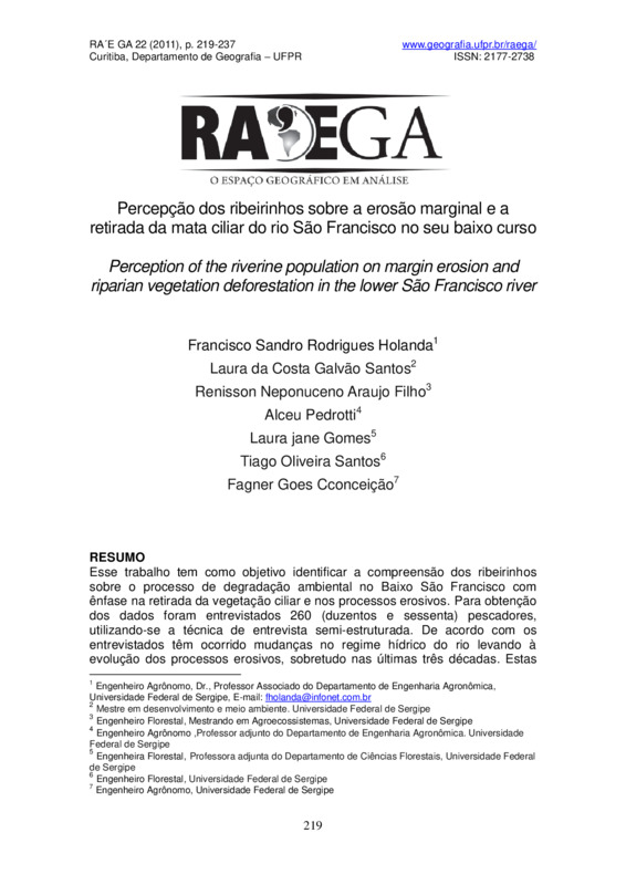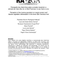 Esse trabalho tem como objetivo identificar a compreensão dos ribeirinhos sobre o processo de degradação ambiental no Baixo São Francisco com ênfase na retirada da vegetação ciliar e nos processos erosivos. Para obtenção dos dados foram entrevistados 260 (duzentos e sessenta) pescadores, utilizando-se a técnica de entrevista semi-estruturada. De acordo com os entrevistados têm ocorrido mudanças no regime hídrico do rio levando à evolução dos processos erosivos, sobretudo nas últimas três décadas. Estas alterações são fruto de políticas de desenvolvimento que ao construir barragens no canal do rio para a geração de energia, potencializaram a problemática ambiental, afetando diretamente a população ribeirinha.