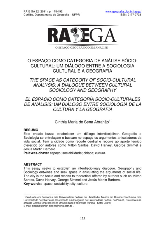 Este ensaio busca estabelecer um diálogo interdisciplinar. Geografia e Sociologia se entrelaçam e buscam no espaço os argumentos articuladores da vida social. Tem a cidade como recorte central e recorre ao aporte teórico oferecido por autores como Milton Santos, David Harvey, George Simmel e Jesús Martin Barbero.
