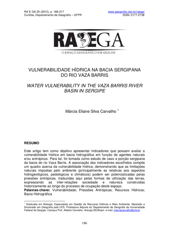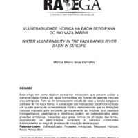 Este artigo tem como objetivo apresentar indicadores que possam avaliar a vulnerabilidade hídrica em bacia hidrográfica em função de agentes naturais e/ou antrópicos. Para tal, foi tomada como estudo de caso a porção sergipana da bacia do rio Vaza Barris. A associação dos indicadores escolhidos compôs um quadro acerca da vulnerabilidade hídrica, demonstrando que as limitações naturais impostas pelo ambiente (principalmente as relativas aos aspectos hidrogeológicos, pedológicos e climáticos) podem ser potencializadas pelas pressões antrópicas, traduzidas aqui pelas formas de utilização das terras, expressando as inter-relações sociedade e natureza construídas historicamente ao longo do processo de ocupação deste espaço.
