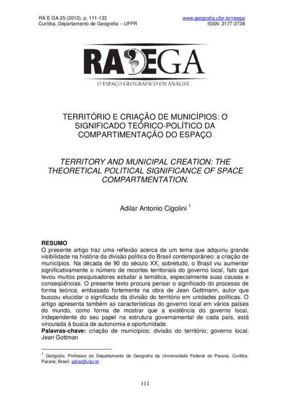 O presente artigo traz uma reflexão acerca de um tema que adquiriu grande visibilidade na história da divisão política do Brasil contemporâneo: a criação de municípios. Na década de 90 do século XX, sobretudo, o Brasil viu aumentar significativamente o número de recortes territoriais do governo local, fato que levou muitos pesquisadores estudar a temática, especialmente suas causas e conseqüências. O presente texto procura pensar o significado do processo de forma teórica, embasado fortemente na obra de Jean Gottmann, autor que buscou elucidar o significado da divisão do território em unidades políticas. O artigo apresenta também as características do governo local em vários países do mundo, como forma de mostrar que a existência do governo local, independente do seu papel na estrutura governamental de cada país, está vinculada à busca de autonomia e oportunidade.