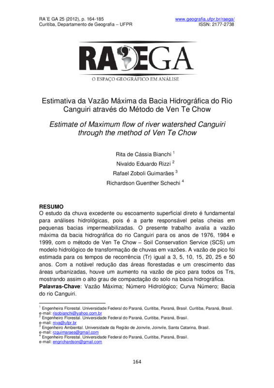 O estudo da chuva excedente ou escoamento superficial direto é fundamental para análises hidrológicas, pois é a parte responsável pelas cheias em pequenas bacias impermeabilizadas. O presente trabalho avalia a vazão máxima da bacia hidrográfica do rio Canguiri para os anos de 1976, 1984 e 1999, com o método de Ven Te Chow – Soil Conservation Service (SCS) um modelo hidrológico de transformação de chuvas em vazões. A vazão de pico foi estimada para os tempos de recorrência (Tr) igual a 3, 5, 10, 15, 20, 25 e 50 anos. Com a notável redução das áreas florestadas e um crescimento das áreas urbanizadas, houve um aumento na vazão de pico para todos os Trs, mostrando assim o alto grau de compactação do solo na bacia hidrográfica.