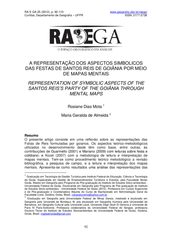 O presente artigo consiste em uma reflexão sobre as representações das Folias de Reis formuladas por goianos. Os aspectos teórico-metodológicos utilizados no desenvolvimento deste têm como base, entre outras, às contribuições de Guarinello (2001) e Mariano (2009) com leituras sobre festa e cotidiano; e Kozel (2007) com a metodologia de leitura e interpretação de mapas mentais. Tem-se como procedimento teórico metodológico a revisão bibliográfica, a pesquisa de campo, e a leitura e interpretação dos mapas mentais. Apresenta-se como resultados uma análise das representações das Folias de Reis para os goianos em ambientes e momentos externos a essas festas.