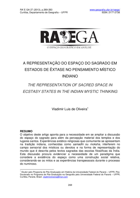 O objetivo deste artigo aponta para a necessidade em se ampliar a discussão do espaço do sagrado para além da percepção material dos templos e dos lugares santos. Experiências extático-religiosas que comumente se apresentam na tradição indiana, conhecidas como samadhi ou moksha, interferem no campo sensorial dos místicos ou devotos e na forma de representação do mundo que é descrita pelos textos sagrados das escolas filosóficas da Índia. Esta discussão procura evidenciar a necessidade de um paradigma que considere a existência do espaço como uma construção social relativa, considerando-se os mitos e as experiências transpessoais durante o processo do numinoso.