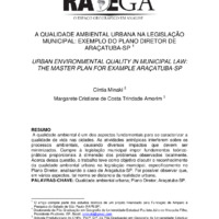 A qualidade ambiental é um dos aspectos fundamentais para se caracterizar a qualidade de vida nas cidades. As atividades antrópicas interferem sobre os processos ambientais, causando diversos impactos que devem ser minimizados. Cumpre à legislação municipal impor fundamentos teóricopráticos proporcionais à dimensão dos problemas observados localmente. Acerca dessa questão, o trabalho teve como objetivo discutir o reconhecimento da qualidade ambiental urbana na legislação municipal, especificamente no Plano Diretor, analisando o caso de Araçatuba-SP. Foi possível observar que, em vários aspectos, tal norma se distancia da realidade urbana.
