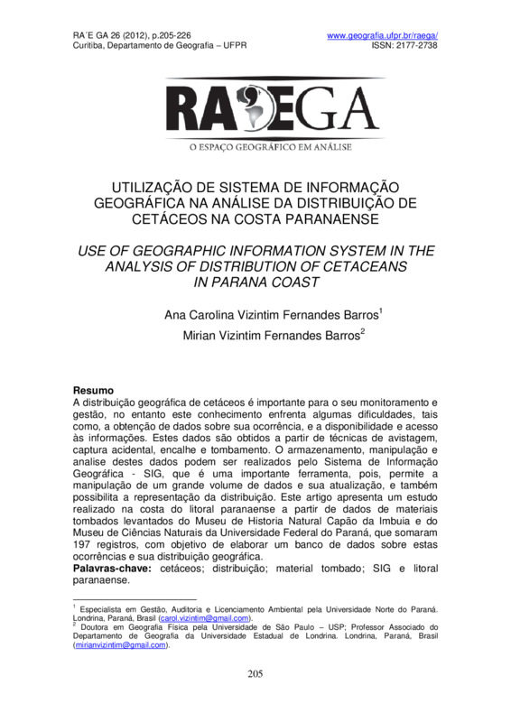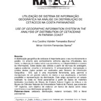 A distribuição geográfica de cetáceos é importante para o seu monitoramento e gestão, no entanto este conhecimento enfrenta algumas dificuldades, tais como, a obtenção de dados sobre sua ocorrência, e a disponibilidade e acesso às informações. Estes dados são obtidos a partir de técnicas de avistagem, captura acidental, encalhe e tombamento. O armazenamento, manipulação e analise destes dados podem ser realizados pelo Sistema de Informação Geográfica - SIG, que é uma importante ferramenta, pois, permite a manipulação de um grande volume de dados e sua atualização, e também possibilita a representação da distribuição. Este artigo apresenta um estudo realizado na costa do litoral paranaense a partir de dados de materiais tombados levantados do Museu de Historia Natural Capão da Imbuia e do Museu de Ciências Naturais da Universidade Federal do Paraná, que somaram 197 registros, com objetivo de elaborar um banco de dados sobre estas ocorrências e sua distribuição geográfica.