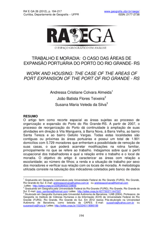 O artigo tem como recorte espacial as áreas sujeitas ao processo de organização e expansão do Porto do Rio Grande-RS. A partir de 2007, o processo de reorganização do Porto dá continuidade à ampliação de suas atividades em direção à Vila Mangueira, à Barra Nova, à Barra Velha, ao bairro Santa Tereza e ao bairro Getúlio Vargas. Todas estas localidades são contíguas ou próximas às áreas portuárias e possui um total de 1.901 domicílios com 5.729 moradores que enfrentam a possibilidade de remoção de suas casas, o que poderá acarretar modificações na rotina familiar, principalmente no que se refere ao trabalho. Indagamos sobre qual o perfil ocupacional dos trabalhadores e qual a relação entre o trabalho e o local de moradia. O objetivo do artigo é caracterizar as áreas com relação a escolaridade; ao número de filhos; a renda e a situação de trabalho por sexo dos moradores e verificar sua relação com os locais de moradia. A metodologia utilizada consiste na tabulação dos indicadores coletados pelo banco de dados do Núcleo de Análises Urbanas (NAU) da FURG e a interpretação a partir dos dois circuitos da economia de Milton Santos e as relações de gênero. A análise dos dados demonstra que grande parte dos moradores trabalha nas áreas ou em locais próximos e depende da localidade onde mora para manter-se no emprego. Indicadores sociais selecionados apontam para situações semelhantes em todas as áreas: baixa escolaridade, situação de trabalho precário e baixa renda familiar.