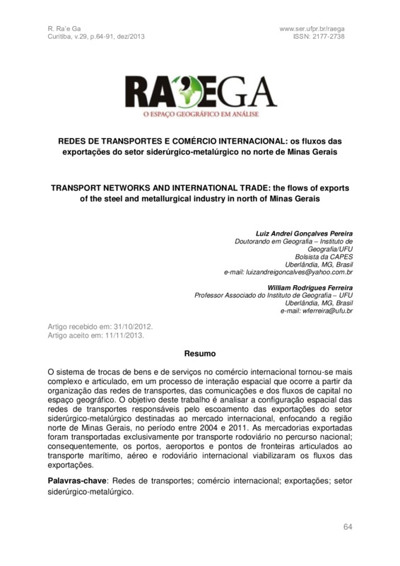 O sistema de trocas de bens e de serviços no comércio internacional tornou-se mais complexo e articulado, em um processo de interação espacial que ocorre a partir da organização das redes de transportes, das comunicações e dos fluxos de capital no espaço geográfico. O objetivo deste trabalho é analisar a configuração espacial das redes de transportes responsáveis pelo escoamento das exportações do setor siderúrgico-metalúrgico destinadas ao mercado internacional, enfocando a região norte de Minas Gerais, no período entre 2004 e 2011. As mercadorias exportadas foram transportadas exclusivamente por transporte rodoviário no percurso nacional; consequentemente, os portos, aeroportos e pontos de fronteiras articulados ao transporte marítimo, aéreo e rodoviário internacional viabilizaram os fluxos das exportações.