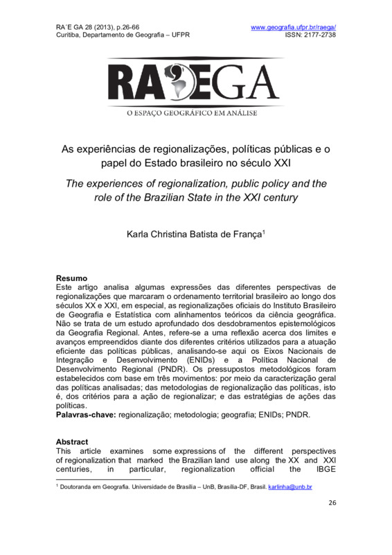 Este artigo analisa algumas expressões das diferentes perspectivas de regionalizações que marcaram o ordenamento territorial brasileiro ao longo dos séculos XX e XXI, em especial, as regionalizações oficiais do Instituto Brasileiro de Geografia e Estatística com alinhamentos teóricos da ciência geográfica. Não se trata de um estudo aprofundado dos desdobramentos epistemológicos da Geografia Regional. Antes, refere-se a uma reflexão acerca dos limites e avanços empreendidos diante dos diferentes critérios utilizados para a atuação eficiente das políticas públicas, analisando-se aqui os Eixos Nacionais de Integração e Desenvolvimento (ENIDs) e a Política Nacional de Desenvolvimento Regional (PNDR). Os pressupostos metodológicos foram estabelecidos com base em três movimentos: por meio da caracterização geral das políticas analisadas; das metodologias de regionalização das políticas, isto é, dos critérios para a ação de regionalizar; e das estratégias de ações das políticas.