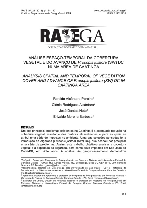 Um dos principais problemas existentes na Caatinga é a acentuada redução na cobertura vegetal, resultante das práticas ali realizadas e para as quais se atribui uma série de impactos no ambiente. Uma das soluções pensadas foi a introdução da Algaroba [Prosopis juliflora (SW) DC], que acabou por precipitar uma série de problemas. Assim, este trabalho objetivou analisar a cobertura vegetal e a expansão da Algaroba, bem como seus impactos em São João do Cariri-PB, em vinte anos. A análise via geoprocessamento demonstrou decréscimos na cobertura vegetal nativa e o crescimento significativo dessa espécie, apontando para a necessidade de maior conhecimento de técnicas de manejo capazes de oferecer condições para o aproveitamento do seu potencial.