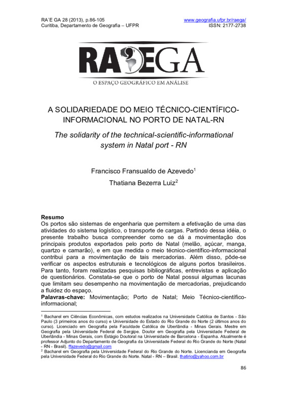 Os portos são sistemas de engenharia que permitem a efetivação de uma das atividades do sistema logístico, o transporte de cargas. Partindo dessa idéia, o presente trabalho busca compreender como se dá a movimentação dos principais produtos exportados pelo porto de Natal (melão, açúcar, manga, quartzo e camarão), e em que medida o meio técnico-científico-informacional contribui para a movimentação de tais mercadorias. Além disso, pôde-se verificar os aspectos estruturais e tecnológicos de alguns portos brasileiros. Para tanto, foram realizadas pesquisas bibliográficas, entrevistas e aplicação de questionários. Constata-se que o porto de Natal possui algumas lacunas que limitam seu desempenho na movimentação de mercadorias, prejudicando a fluidez do espaço.