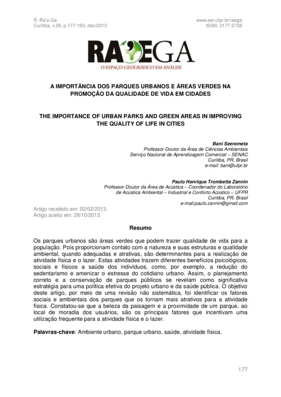 Os parques urbanos são áreas verdes que podem trazer qualidade de vida para a população. Pois proporcionam contato com a natureza e suas estruturas e qualidade ambiental, quando adequadas e atrativas, são determinantes para a realização de atividade física e o lazer. Estas atividades trazem diferentes benefícios psicológicos, sociais e físicos a saúde dos indivíduos, como, por exemplo, a redução do sedentarismo e amenizar o estresse do cotidiano urbano. Assim, o planejamento correto e a conservação de parques públicos se revelam como significativa estratégia para uma política efetiva do projeto urbano e da saúde pública. O objetivo deste artigo, por meio de uma revisão não sistemática, foi identificar os fatores sociais e ambientais dos parques que os tornam mais atrativos para a atividade física. Constatou-se que a beleza da paisagem e a proximidade de um parque, ao local de moradia dos usuários, são os principais fatores que incentivam uma utilização frequente para a atividade física e o lazer.