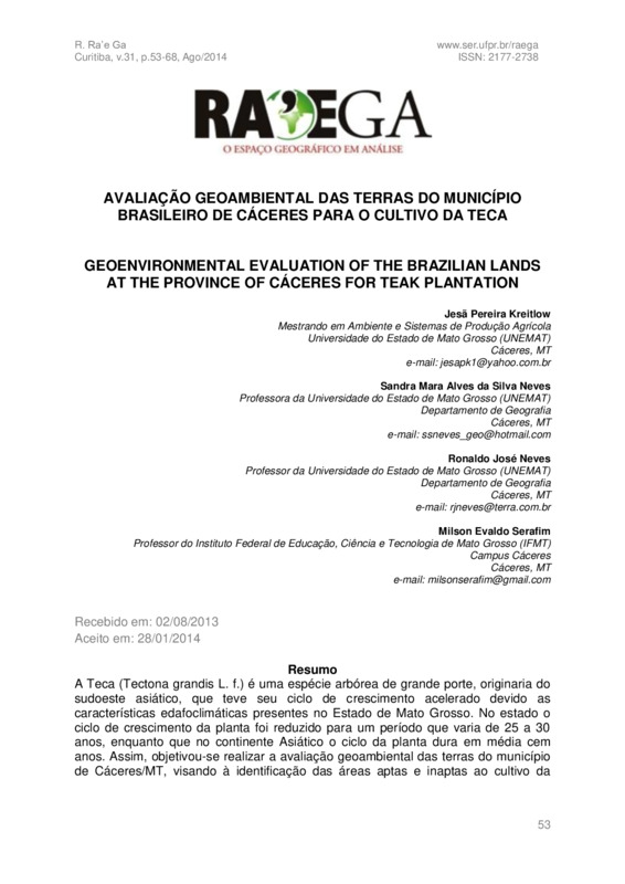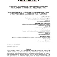 A Teca (Tectona grandis L. f.) é uma espécie arbórea de grande porte, originária do sudoeste asiático, que teve seu ciclo de crescimento acelerado devido às características edafoclimáticas presentes no estado de Mato Grosso. Assim, objetivou-se realizar a avaliação geoambiental das terras do município de Cáceres/MT, visando à identificação das áreas aptas e inaptas ao cultivo da Teca. A metodologia para operacionalização desta pesquisa ocorreu por meio de geotecnologias. Os resultados mostraram que em Cáceres 5.046 Km2 são considerados aptos para a cultura da Teca e 19.305 Km2 inaptos, sendo que as áreas aptas se localizam nos vales da Província Serrana e em porções com relevo plano, situados a oeste do perímetro urbano. As informações geradas neste estudo podem contribuir no planejamento da atividade e na gestão territorial municipal de Cáceres, situado na região sudoeste mato-grossense.