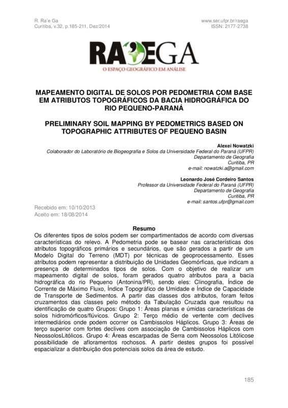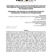 Os diferentes tipos de solos podem ser compartimentados de acordo com diversas características do relevo. A Pedometria pode se basear nas características dos atributos topográficos primários e secundários, que são gerados a partir de um Modelo Digital do Terreno (MDT) por técnicas de geoprocessamento. Esses atributos podem representar a distribuição de Unidades Geomórficas, que indicam a presença de determinados tipos de solos. Com o objetivo de realizar um mapeamento digital de solos, foram gerados quatro atributos para a bacia hidrográfica do rio Pequeno (Antonina/PR), sendo eles: Clinografia, Índice de Corrente de Máximo Fluxo, Índice Topográfico de Umidade e Índice de Capacidade de Transporte de Sedimentos. A partir das classes dos atributos, foram feitos cruzamentos das classes pelo método da Tabulação Cruzada que resultou na identificação de quatro Grupos: Grupo 1: Áreas planas e úmidas características de solos hidromórficos/flúvicos. Grupo 2: Terço médio de vertente com declives intermediários onde podem ocorrer os Cambissolos Háplicos. Grupo 3: Áreas de terço superior com fortes declives com associação de Cambissolos Háplicos com NeossolosLitólicos. Grupo 4: Áreas escarpadas de Serra com Neossolos Litólicose possibilidade de afloramentos rochosos. A partir destes grupos foi possível espacializar a distribuição dos potenciais solos da área de estudo.