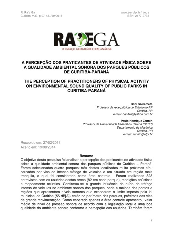 O objetivo desta pesquisa foi analisar a percepção dos praticantes de atividade física sobre a qualidade ambiental sonora dos parques públicos de Curitiba – Paraná. Foram selecionados quatro parques: três destes localizados muito próximos e/ou cercados por vias de intenso tráfego de veículos e um situado em região mais tranquila, o qual foi considerado como área controle. Foram realizadas 328 entrevistas com os usuários destas áreas (82 em cada parque), medições acústicas e mapeamento acústico. Confirmou-se a grande influência do ruído do tráfego intenso de veículos no ambiente sonoro dos parques, onde a maioria dos pontos e regiões que apresentam níveis sonoros que excederam o limite imposto pela lei municipal de Curitiba (55 dB[A]) estão no perímetro dos parques, próximos das vias de grande movimentação. Como esperado apenas a área controle apresentou valor médio de nível de pressão sonora de acordo com a legislação local e uma boa qualidade do ambiente sonoro conforme a percepção dos usuários. Também foram identificadas outras condições no ambiente, além dos níveis de pressão sonora e forma urbana do entorno, que interferem conjuntamente na paisagem sonora dos parques e na sua percepção pelos frequentadores, tais como: o grau de incômodo ao ruído de trânsito, os tipos de sons que integram a paisagem sonora, a paisagem visual, as expectativas dos usuários aos sons, e os locais das estruturas dos equipamentos de lazer e atividade física.