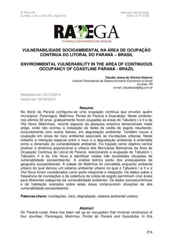 No litoral do Paraná configurou-se uma ocupação contínua que envolve quatro municípios: Paranaguá, Matinhos, Pontal do Paraná e Guaratuba. Neste contexto, nos últimos 30 anos, gradualmente foram ocupadas as áreas do Tabuleiro I e II e da Vila Nova (Matinhos), recorte espacial da pesquisa empírica demonstrada neste artigo, onde não ocorreu à instalação de redes de coleta de esgoto resultando, conjuntamente com outros fatores, em degradação ambiental. Também houve a ocupação em áreas de risco ambiental associado às inundações urbanas. Neste trabalho a interação espacial entre o risco e a degradação ambiental é entendida como a dimensão da vulnerabilidade ambiental. Foi traçado como objetivo central analisar a dinâmica populacional e urbana dos Municípios Balneários da Área de Ocupação Contínua do Litoral do Paraná, relacionando a ocupação do Tabuleiro I, Tabuleiro II e da Vila Nova e identificar nestas três localidades situações de vulnerabilidade socioambiental. A análise teórica partiu dos pressupostos da geografia socioambiental. A cidade de Matinhos foi concebida enquanto ambiente urbano do qual derivou um sistema ambiental urbano no qual o Tabuleiro I e II e a Vila Nova foram considerados como parte integrante e integrada. Os dados sobre a frequência de inundações e da cobertura da coleta de esgoto permitiram criar áreas para diferentes categorias de vulnerabilidade ambiental. Os dados socioeconômicos e de habitação avaliados sobre estas áreas comprovaram situações de alta vulnerabilidade socioambiental.
