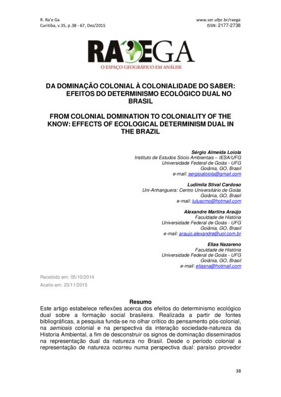 Este artigo estabelece reflexões acerca dos efeitos do determinismo ecológico dual sobre a formação social brasileira. Realizada a partir de fontes bibliográficas, a pesquisa funda-se no olhar crítico do pensamento pós-colonial, na semiosis colonial e na perspectiva da interação sociedade-natureza da historia ambiental, a fim de desconstruir os signos de dominação disseminados na representação dual da natureza no Brasil. Desde o período colonial a representação de natureza ocorreu numa perspectiva dual: paraíso provedor de riquezas, e/ou fator limitante à sociedade; ambas representações tributárias do determinismo ecológico, fundado, sobretudo, na ideia aristotélica dos trópicos como fator limitante às sociedades e na Teoria do degeneracionismo. Esse dualismo originou-se a partir da visão utilitarista e externalizada da relação sociedade-natureza, durante o processo de dominação colonial. Influenciou a construção do “ser brasileiro”, já que as identidades do povo brasileiro estiveram associadas a noção de selvagem, florestas, meio ecológico e riquezas naturais, operando no modo como o brasileiro se vê, e é visto. Os resultados expõem que, se antes os signos da dominação colonial travestidos de “destino ecológico” eram externos, no presente encontram-se internalizados na mídia, literatura, ciência e na política, oferecendo barreira mental para a identificação das potencialidades e limites do meio ecológico, bem como o desenvolvimento de uma sociedade com elevada sustentabilidade.