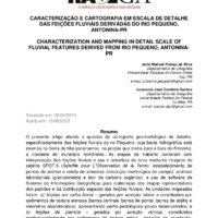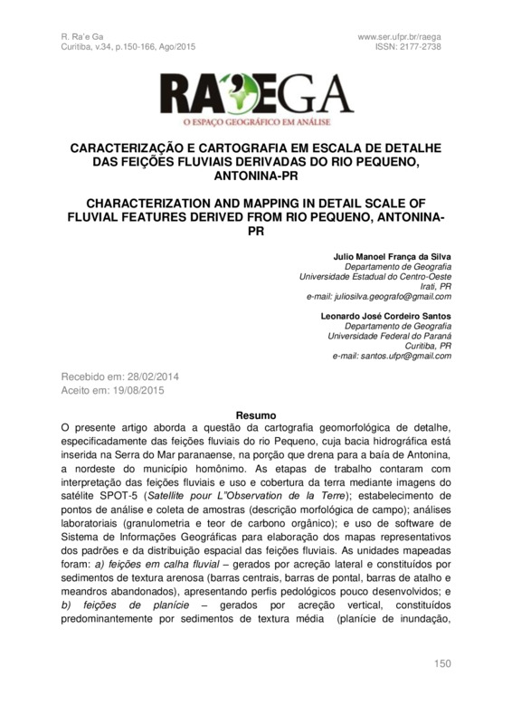 O presente artigo aborda a questão da cartografia geomorfológica de detalhe, especificadamente das feições fluviais do rio Pequeno, cuja bacia hidrográfica está inserida na Serra do Mar paranaense, na porção que drena para a baía de Antonina, a nordeste do município homônimo. As etapas de trabalho contaram com interpretação das feições fluviais e uso e cobertura da terra mediante imagens do satélite SPOT-5 (Satellite pour L”Observation de la Terre); estabelecimento de pontos de análise e coleta de amostras (descrição morfológica de campo); análises laboratoriais (granulometria e teor de carbono orgânico); e uso de software de Sistema de Informações Geográficas para elaboração dos mapas representativos dos padrões e da distribuição espacial das feições fluviais. As unidades mapeadas foram: a) feições em calha fluvial – gerados por acreção lateral e constituídos por sedimentos de textura arenosa (barras centrais, barras de pontal, barras de atalho e meandros abandonados), apresentando perfis pedológicos pouco desenvolvidos; e b) feições de planície – gerados por acreção vertical, constituídos predominantemente por sedimentos de textura média (planície de inundação, terraços fluviais, planície distal, sulcos e lagoas), apresentando desde solos de maturação intermediária a bem desenvolvidos.