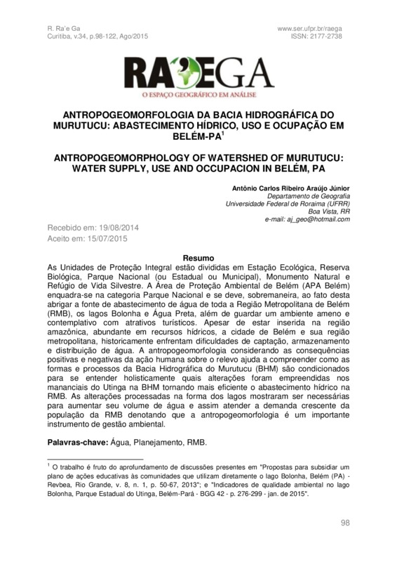 As Unidades de Proteção Integral estão divididasem Estação Ecológica, Reserva Biológica, Parque Nacional (ou Estadual ou Municipal), Monumento Natural e Refúgio de Vida Silvestre. A Área de Proteção Ambiental de Belém (APA Belém) enquadra-se na categoria Parque Nacional e se deve, sobremaneira, ao fato desta abrigar a fonte de abastecimento de água de toda a Região Metropolitana de Belém (RMB), os lagos Bolonha e Água Preta, além de guardar um ambiente ameno e contemplativo com atrativos turísticos. Apesar de estar inserida na região amazônica, abundante em recursos hídricos, a cidade de Belém e sua região metropolitana, historicamente enfrentam dificuldades de captação, armazenamento e distribuição de água. A antropogeomorfologia considerando as consequências positivas e negativas da ação humana sobre o relevo ajuda a compreender como as formas e processos da Bacia Hidrográfica do Murutucu (BHM) são condicionados para se entender holisticamente quais alterações foram empreendidas nos mananciais do Utinga na BHM tornando mais eficiente o abastecimento hídrico na RMB. As alterações processadas na forma dos lagos mostraram ser necessárias para aumentar seu volume de água e assim atender a demanda crescente da população da RMB denotando que a antropogeomorfologia é um importante instrumento de gestão ambiental.