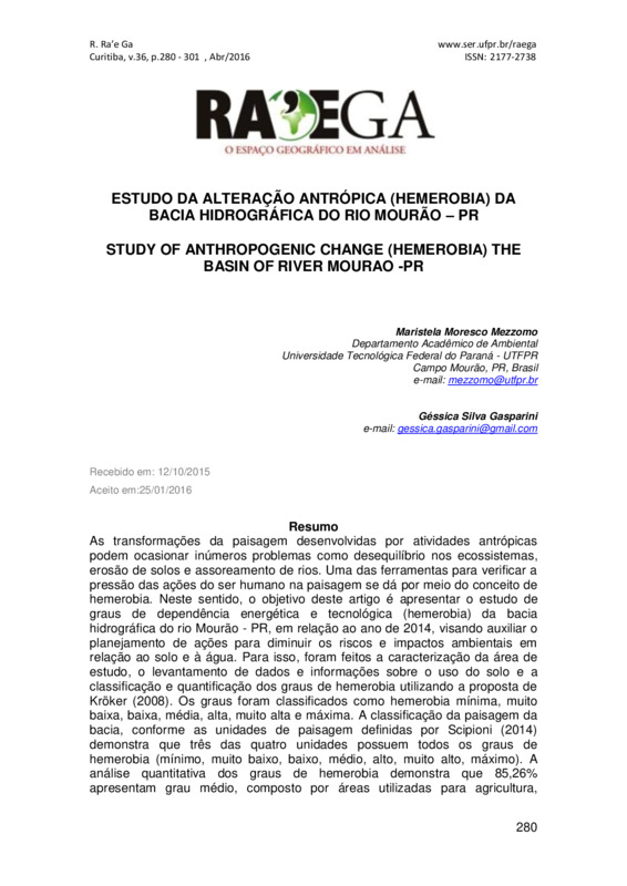 As transformações da paisagem desenvolvidas por atividades antrópicas podem ocasionar inúmeros problemas como desequilíbrio nos ecossistemas, erosão de solos e assoreamento de rios. Uma das ferramentas para verificar a pressão das ações do ser humano na paisagem se dá por meio do conceito de hemerobia. Neste sentido, o objetivo deste artigo é apresentar a definição de graus de dependência energética e tecnológica (hemerobia) da bacia hidrográfica do rio Mourão - PR, visando auxiliar o planejamento de ações para diminuir os riscos e impactos ambientais em relação ao solo e à água. Para isso, foram feitos a caracterização da área de estudo, o levantamento de dados e informações sobre o uso do solo e a classificação e quantificação dos graus de hemerobia utilizando a proposta de Kröker (2008). Os graus foram classificados como hemerobia mínima, muito baixa, baixa, média, alta, muito alta e máxima. A classificação da paisagem da bacia, conforme as unidades de paisagem definidas por Scipioni (2014), demonstra que três das quatro unidades possuem todos os graus de hemerobia. A análise quantitativa dos graus de hemerobia demonstra que 85,26% apresentam grau médio, composto por áreas utilizadas para agricultura, pecuária, solo exposto e áreas para futuras construções, e 7,81% representa o grau mínimo utilizado por Unidades de Conservação, Áreas de Preservação Permanente e fragmentos florestais. Esta classificação possibilitou identificar determinadas funções da paisagem, podendo assim, contribuir no planejamento e direcionamento de ações sobre o uso e a ocupação do solo.