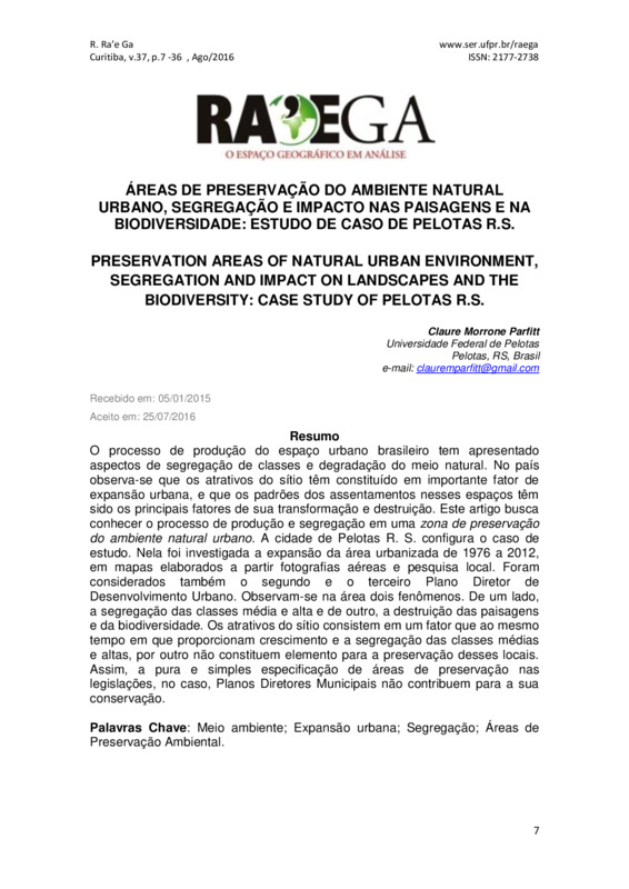 O processo de produção do espaço urbano brasileiro tem apresentado aspectos de segregação de classes e degradação do meio natural. No país observa-se que os atrativos do sítio têm constituído em importante fator de expansão urbana, e que os padrões dos assentamentos nesses espaços têm sido os principais fatores de sua transformação e destruição. Este artigo busca conhecer o processo de produção e segregação em uma zona de preservação do ambiente natural urbano. A cidade de Pelotas R. S. configura o caso de estudo. Nela foi investigada a expansão da área urbanizada de 1976 a 2012, em mapas elaboradosa partir fotografias aéreas e pesquisa local. Foram considerados também o segundo e o terceiro Plano Diretor de desenvolvimento urbano. Observam-se na área dois fenômenos. De um lado, a segregação das classes média e alta e de outro, a destruição das paisagens e da biodiversidade. Os atrativos do sítio consistem em um fator que ao mesmo tempo em que proporcionam crescimento e a segregação das classes médias e altas, por outro não constituem elemento para a preservação desses locais. Assim, a pura e simples especificação de áreas de preservação nas legislações, no caso, Planos Diretores Municipais não contribuem para a sua conservação.