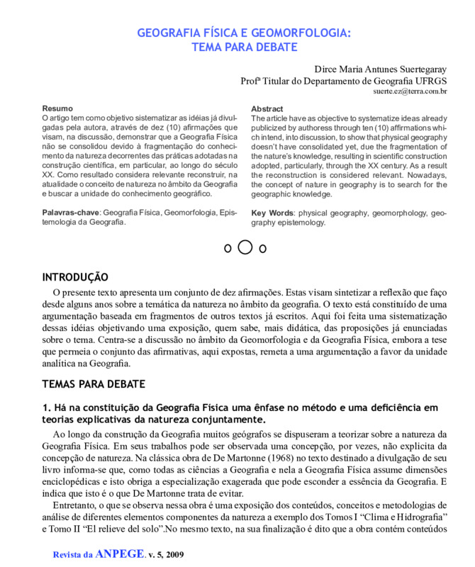 O artigo tem como objetivo sistematizar as ideias já divulgadas pela autora, através de dez (10) afirmações que visam, na discussão, demonstrar que a Geografia Física não se consolidou devido à fragmentação do conhecimento da natureza decorrentes das práticas adotadas na construção científica, em particular, ao longo do século XX. Como resultado considera relevante reconstruir, na atualidade o conceito de natureza no âmbito da Geografia e buscar a unidade do conhecimento geográfico.