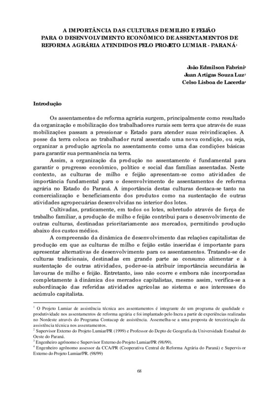 A IMPORTÂNCIA DAS CULTURAS DE MILHO E FEIJÃO PARA O DESENVOLVIMENTO ECONÔMICO DE ASSENTAMENTOS DE REFORMA AGRÁRIA ATENDIDOS PELO PROJETO LUMIAR - PARANÁ