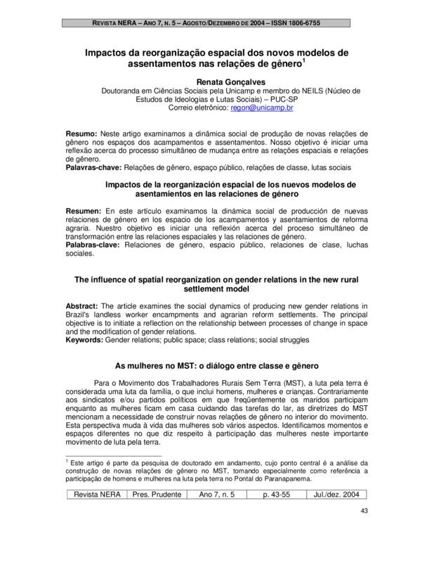 IMPACTOS DA REORGANIZAÇÃO ESPACIAL DOS NOVOS MODELOS DE ASSENTAMENTOS NAS RELAÇÕES DE GÊNERO