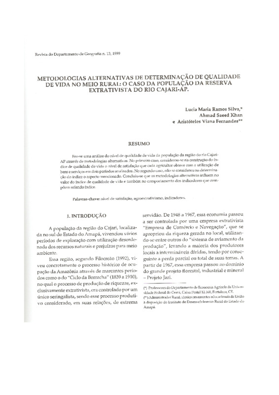 METODOLOGIAS ALTERNATIVAS DE DETERMINAÇÃO DE QUALIDADE DE VIDA NO MEIO RURAL: O CASO DA POPULAÇÃO DA RESERVA EXTRATIVISTA DO RIO CAJARI-AP