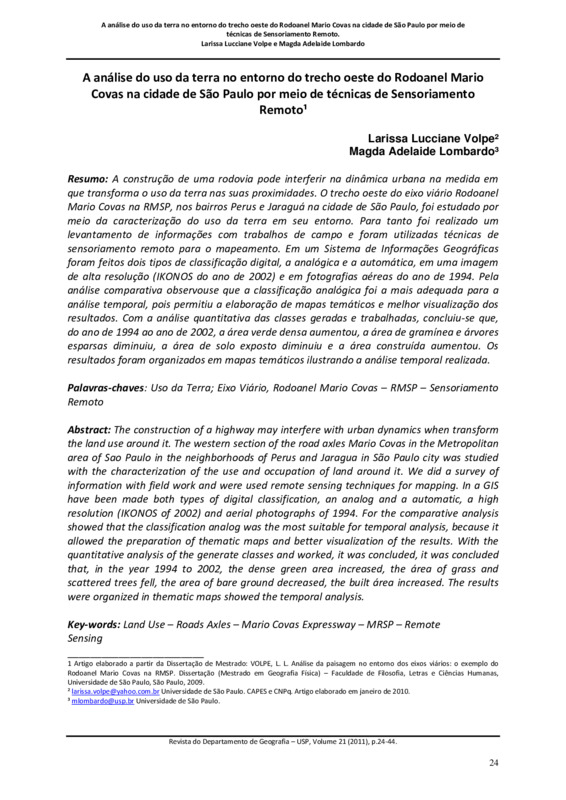 A construção de uma rodovia pode interferir na dinâmica urbana na medida em que transforma o uso da terra nas suas proximidades. O trecho oeste do eixo viário Rodoanel Mario Covas na RMSP, nos bairros Perus e Jaraguá na cidade de São Paulo, foi estudado por meio da caracterização do uso da terra em seu entorno. Para tanto foi realizado um levantamento de informações com trabalhos de campo e foram utilizadas técnicas de sensoriamento remoto para o mapeamento. Em um Sistema de Informações Geográficas foram feitos dois tipos de classificação digital, a analógica e a automática, em uma imagem de alta resolução (IKONOS do ano de 2002) e em fotografias aéreas do ano de 1994. Pela análise comparativa observouse que a classificação analógica foi a mais adequada para a análise temporal, pois permitiu a elaboração de mapas temáticos e melhor visualização dos resultados. Com a análise quantitativa das classes geradas e trabalhadas, concluiu-se que, do ano de 1994 ao ano de 2002, a área verde densa aumentou, a área de gramínea e árvores esparsas diminuiu, a área de solo exposto diminuiu e a área construída aumentou. Os resultados foram organizados em mapas temáticos ilustrando a análise temporal realizada