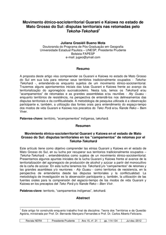 A proposta deste artigo visa compreender os Guarani e Kaiowa no estado de Mato Grosso do Sul em sua luta para retomar seus territórios tradicionalmente ocupados - Tekoha-Tekoharã -, entendendo-os enquanto sujeitos de um movimento étnico-socioterritorial. Trazemos alguns apontamentos iniciais das lutas Guarani e Kaiowa frente ao avanço da territorialização do agronegócio sucroalcooleiro. Nesta luta, temos os Tekoharã e/ou “acampamentos” de retomadas e as grandes assembleias e/ou reuniões - Aty Guasu - enquanto territórios de resistência, na perspectiva de entendê-los nos delineamentos das disputas territoriais e da conflitualidade. A metodologia de pesquisa utilizada é a observação participante e, também, a utilização das fontes orais para entendimento do espaço-tempo dos modos de vida Guarani e Kaiowa nos preceitos do Teko Porã e/ou Ñande Reko – Bem Viver.