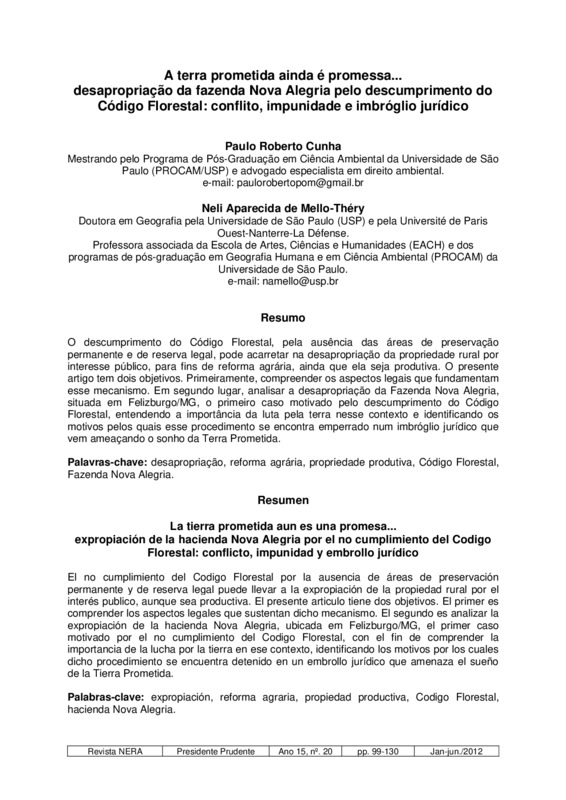 A TERRA PROMETIDA AINDA É PROMESSA... DESAPROPRIAÇÃO DA FAZENDA NOVA ALEGRIA PELO DESCUMPRIMENTO DO CÓDIGO FLORESTAL: CONFLITO, IMPUNIDADE E IMBRÓGLIO JURÍDICO (The promised land is still a promise... dispossession of Nova Alegria farm due to non...)