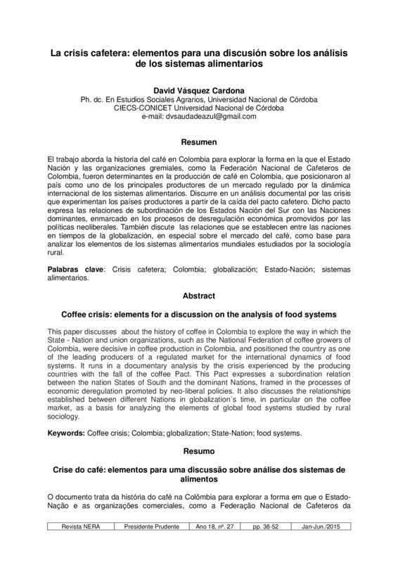 LA CRISIS CAFETERA: ELEMENTOS PARA UNA DISCUSIÓN SOBRE LOS ANÁLISIS DE LOS SISTEMAS ALIMENTARIOS (Coffee crisis: elements for a discussion on the analysis of food systems)