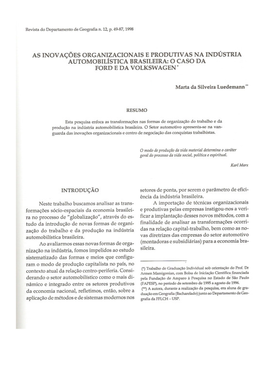 AS INOVAÇÕES ORGANIZACIONAIS E PRODUTIVAS NA INDÚSTRIA AUTOMOBILÍSTICA BRASILEIRA: O CASO DA FORD E DA WOLKSWAGEN