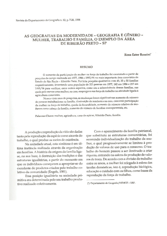 AS GEOGRAFIAS DA MODERNIDADE - GEOGRAFIA E GÊNERO - MULHER, TRABALHO E FAMÍLIA. O EXEMPLO DA ÁREA DE RIBEIRÃO PRETO-SP