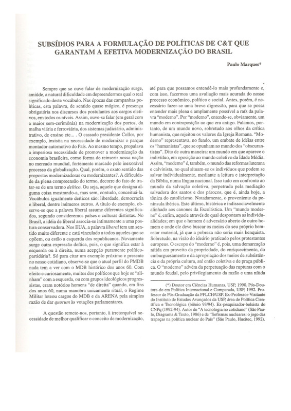 - SUBSÍDIOS PARA FORMULAÇÃO DE POLÍTICAS DE C&T QUE GARANTAM A EFETIVA MODERNIZAÇÃO DO BRASIL