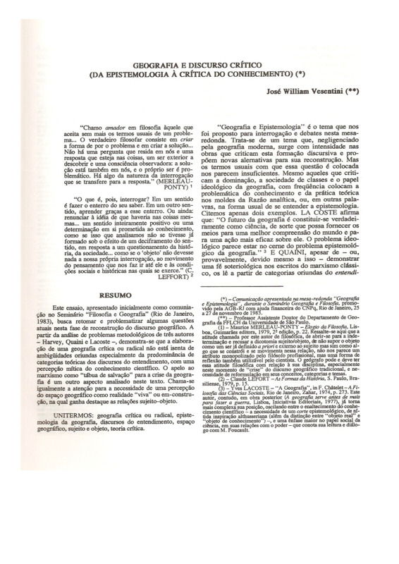 - GEOGRAFIA E DISCURSO CRÍTICO (DA EPISTEMOLOGIA À CRÍTICA DO CONHECIMENTO)