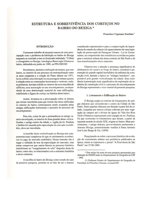 ESTRUTURA E SOBREVIVÊNCIA DOS CORTIÇOS NO BAIRRO BEXIGA