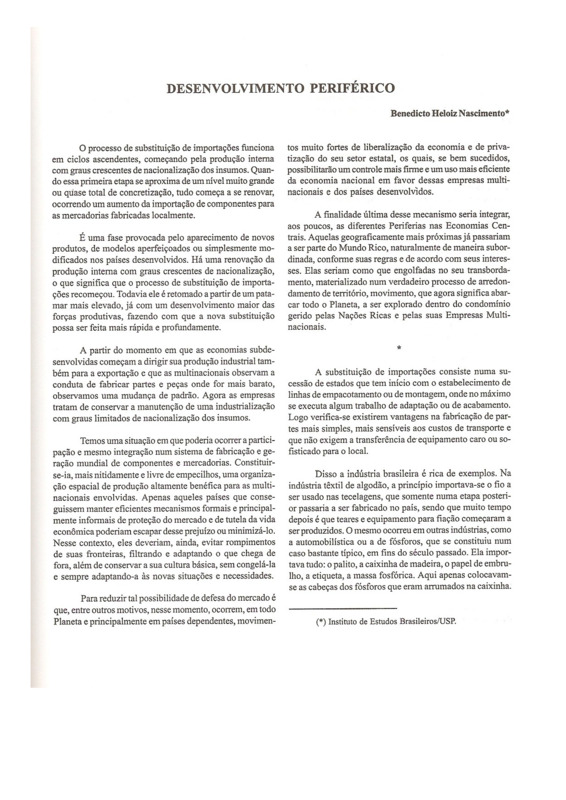 Import substitution, the brazilian way of development never has and end. It does not surpass is economic dependence, reaching an autonomous development. People is unable to fight against those facts by its own conditions of poverty, ignorance and lack of more cohesion. The country has some areas of weakness in foreign enterprises and immigrants, which are estimulated by developped nations trying make profit with them, leaving the country in a position of easy control.
