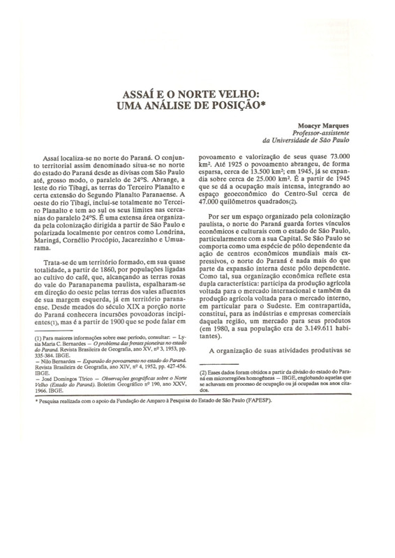 O artigo trata da localização de Assaí no norte do estado do Paraná através de uma abordagem de aproximação sucessiva. A partir de uma visão geral do norte do Paraná em seu quadro temporal mais amplo, vai-se, analiticamente, focalizando divisões sub-regionais que interessam ao objetivo principal até se chegar à área de Assaí, no interflúvio Congonhas – Tibagi. Aí então são analisadas as estruturas territoriais (naturais, viárias, produtivas, de colonização) que tornaram possível aquele centro urbano.