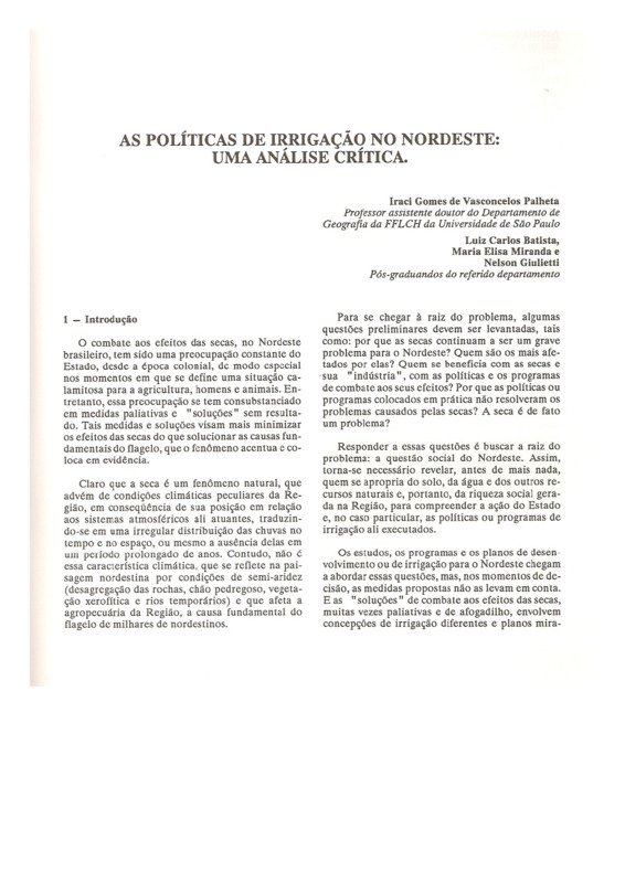 The denaturalization of the Brazilian 'Nordeste' is the aim of this paper. The private appropriation of socially produced resouces and wealth in irrigated areas and primeters with the state support by means of political programs of irrigation is discussed. It also points out the deep transformations suffered by the agrariam areas in the 'sertão' because of the expansion of agro-industries, small-property producers turn into workers of the capital, or migrate to other regions where they reproduce themselves or increase the industrial reserve army in nig urban centers. Finally, this paper recovers the strggle agaist drought consequences, offers a balance of recent irrigation politics and evaluates them critically.
