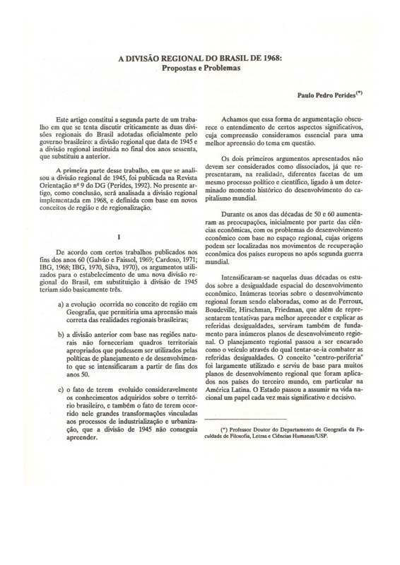 Esse artigo representa a segunda parte de um trabalho no qual analisamos as duas primeiras divisões regionais implementadas oficialmente pelo governo federal: as divisões de 1945 e de 1968. Essa análise fundamentou-se nos seguintes pressupostos: que o conceito de região em Geografia pode apresentar diferentes significados e naturezas considerando-se os referenciais teóricos-metodológicos utilizados - que cada conceito de região, como objeto construuido, está carregado de intencionalidade ideológica, e devem ser interpretados em função das condições históricas em que foram elaborados - que o conceito de região tem sido elaborado e utilizado como um instrumento de ação a serviço de determinados interesses.