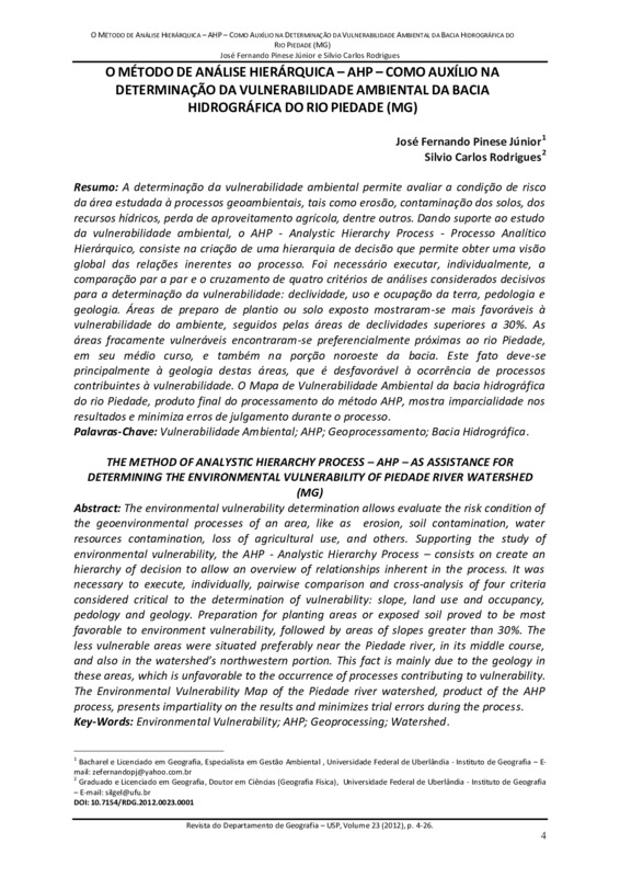 O MÉTODO DE ANÁLISE HIERÁRQUICA – AHP – COMO AUXÍLIO NA DETERMINAÇÃO DA VULNERABILIDADE AMBIENTAL DA BACIA HIDROGRÁFICA DO RIO PIEDADE (MG) - DOI: 10.7154/RDG.2012.0023.0001